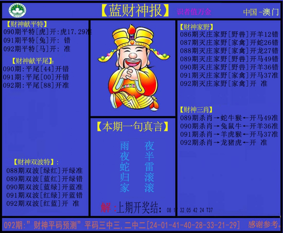 092期: 澳门六合皇彩圖信封【蓝财神报】每期自动更新